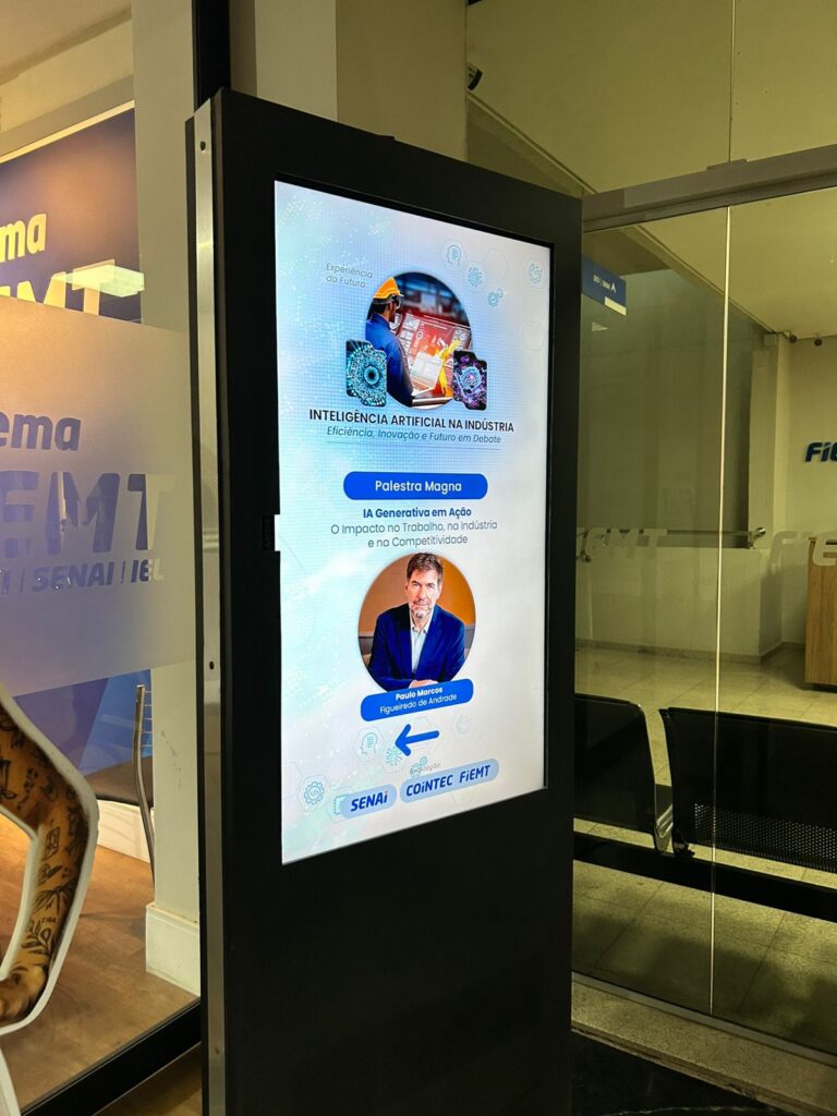 Logo na entrada, os participantes eram recebidos pelo painel digital da FIEMT, que anunciava a palestra magna do professor Paulo Andrade. A imagem reforçava a expectativa de uma noite dedicada ao futuro da inovação.